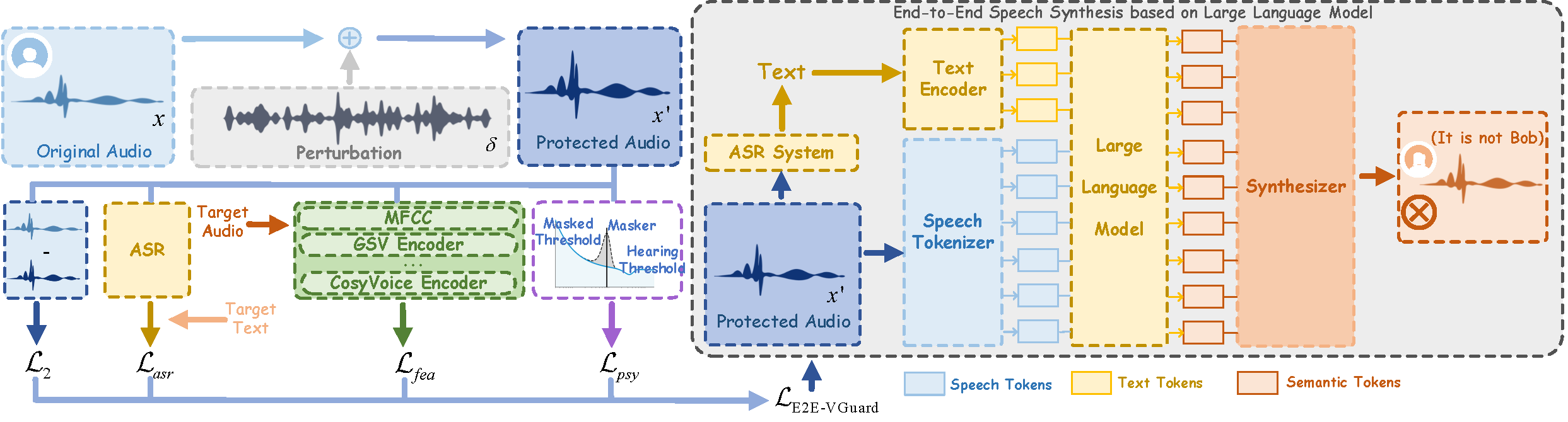 Abstract: Recent advancements in speech synthesis technology have enriched our daily lives, with high-quality and human-like audio widely adopted across real-world applications. However, malicious exploitation like voice-cloning fraud poses severe security risks. Existing defense techniques struggle to address the production large language model (LLM)-based speech synthesis. While previous studies have considered the protection for fine-tuning synthesizers, they assume manually annotated transcripts. Given the labor intensity of manual annotation, end-to-end (E2E) systems leveraging automatic speech recognition (ASR) to generate transcripts are becoming increasingly prevalent, e.g., voice cloning via commercial APIs. Therefore, this E2E speech synthesis also requires new security mechanisms. To tackle these challenges, we propose E2E-VGuard, a proactive defense framework for two emerging threats: (1) production LLM-based speech synthesis, and (2) the novel attack arising from ASR-driven E2E scenarios. Specifically, we employ the encoder ensemble with a feature extractor to protect timbre, while ASR-targeted adversarial examples disrupt pronunciation. Moreover, we incorporate the psychoacoustic model to ensure perturbative imperceptibility. For a comprehensive evaluation, we test 16 open-source synthesizers and 3 commercial APIs across Chinese and English datasets, confirming E2E-VGuard's effectiveness in timbre and pronunciation protection. Real-world deployment validation is also conducted. Our code and demo page are available at https://wxzyd123.github.io/e2e-vguard/.
